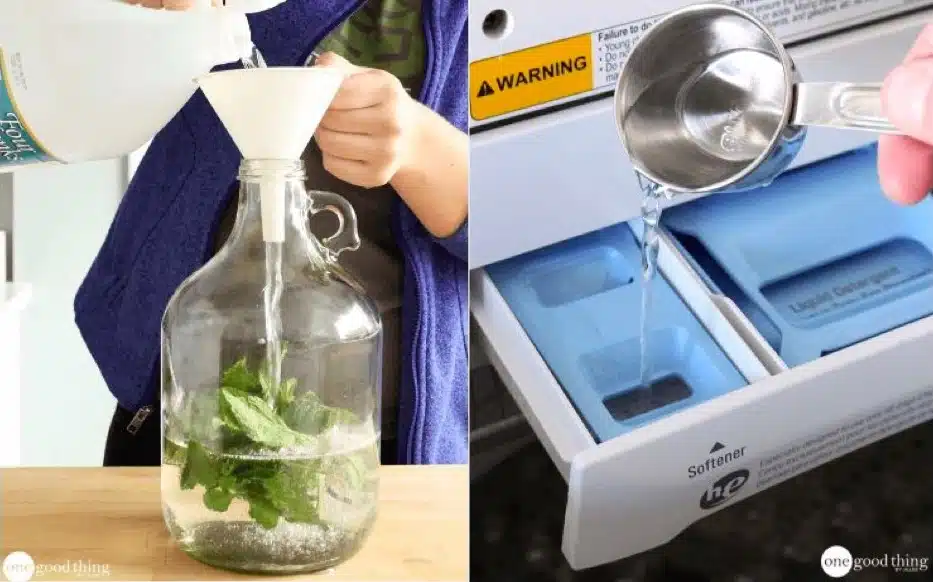 O vinagre combate o calcário que torna as roupas ásperas e desagradáveis ao toque. Ele também desodoriza roupas muito malcheirosas (roupas esportivas, etc.). Quando usado sozinho, ele não deixa nenhum odor nas roupas. No entanto, quando se adiciona hortelã, ela acrescenta uma dose muito agradável de frescor. Além disso, esse produto caseiro é suave para peles sensíveis e não contém fragrâncias ou conservantes altamente alergênicos. Assim, você pode amaciar a roupa lavada, eliminar odores desagradáveis e perfumar delicadamente suas roupas limpas em uma única etapa!