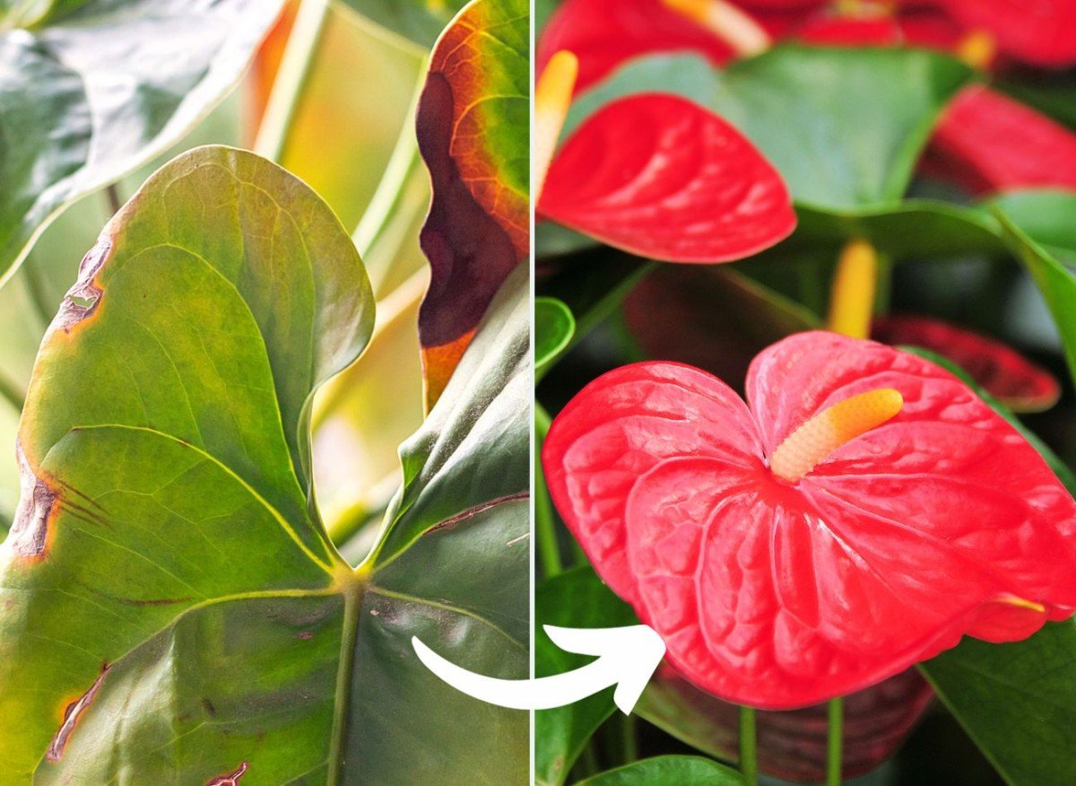 Se as folhas do seu antúrio estão amarelando e ficando marrons, e as flores não estão crescendo como deveriam, é possível que a planta precise de alguns cuidados extras para se recuperar. Aqui está um método que costuma ajudar: