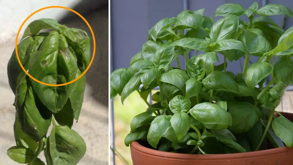 • Se as folhas da albahaca estão murchando e apresentando manchas marrons, pode ser uma doença fúngica conhecida como “mancha foliar”.