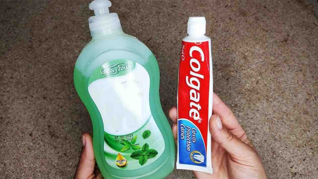 Ao misturar líquido de lavagem de louça e pasta de dente você obtém uma mistura espumosa que pode ser usada para muitas coisas na casa. Veja a seguir como preparar a mistura: